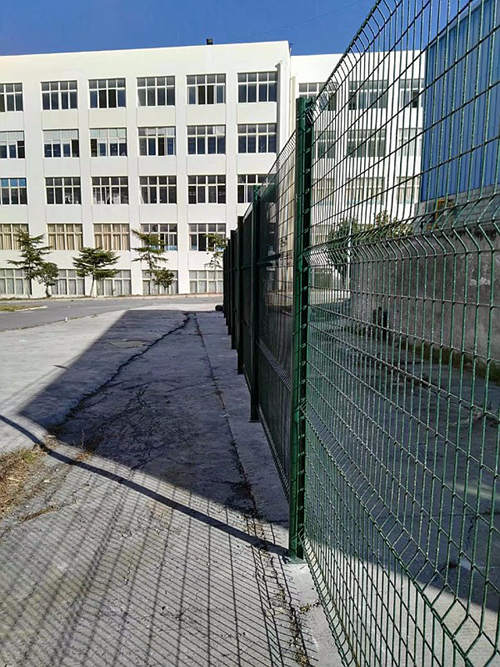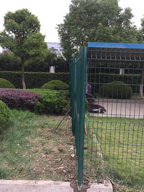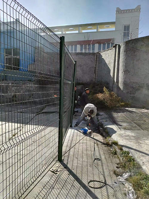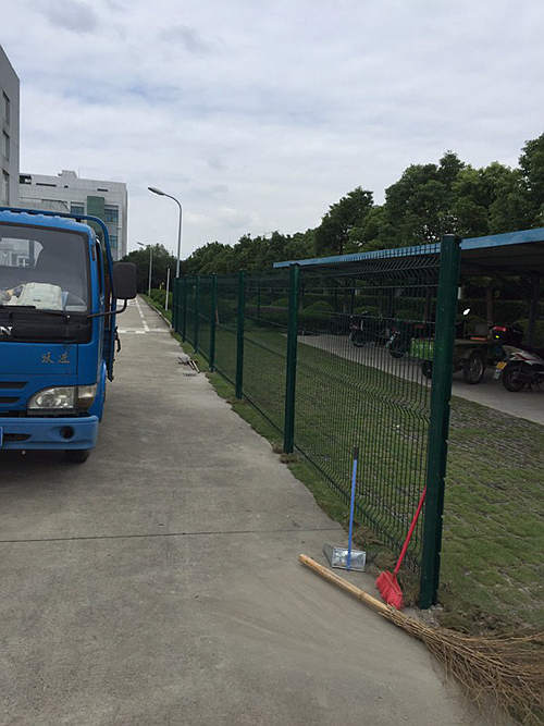 下圖是蘇州工業園區一家化工企業為區域分隔采購的蘇州桃形柱護欄網安裝時拍攝的照片。客戶選擇的是桃形柱護欄網,立柱用的100*70mm桃形柱,鋼絲直徑為浸塑后5.0mm,網孔間距為50*200mm,這批南京護欄網的立柱和網片均是墨綠色。