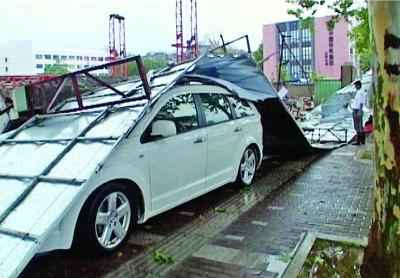 大風吹倒南京護欄網圍擋砸車